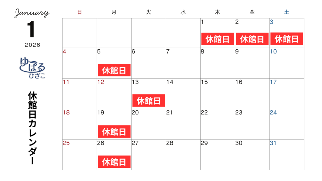 2026年の営業再開は2026年1月4日(日)となります。※1/5(月)は月曜日のため通常休館。