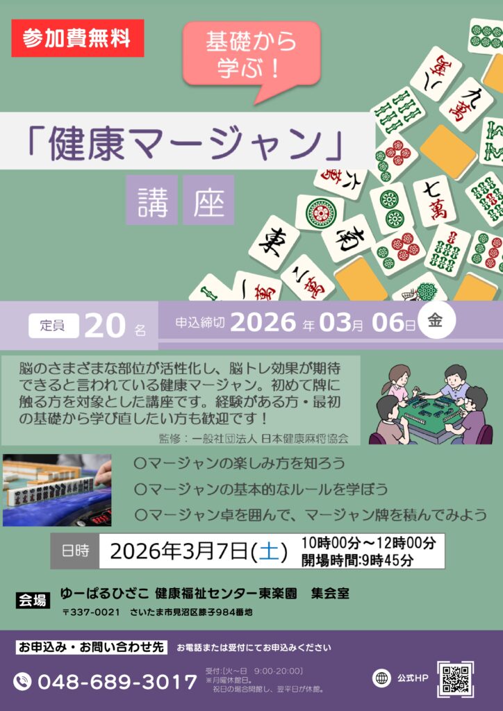 【満員御礼】【自主事業】健康麻雀教室(2026年3月7日)