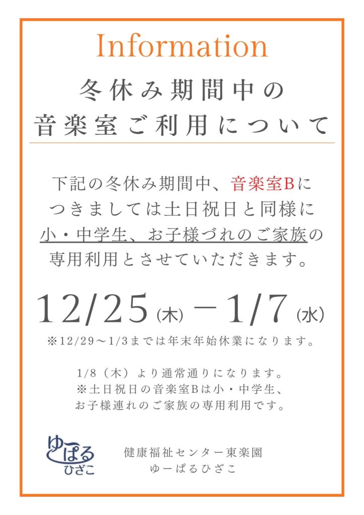 いつもゆーぱる ひざこ(健康福祉センター東楽園)をご利用いただきありがとうございます。 冬休み期間中の音楽室Bのご案内です。